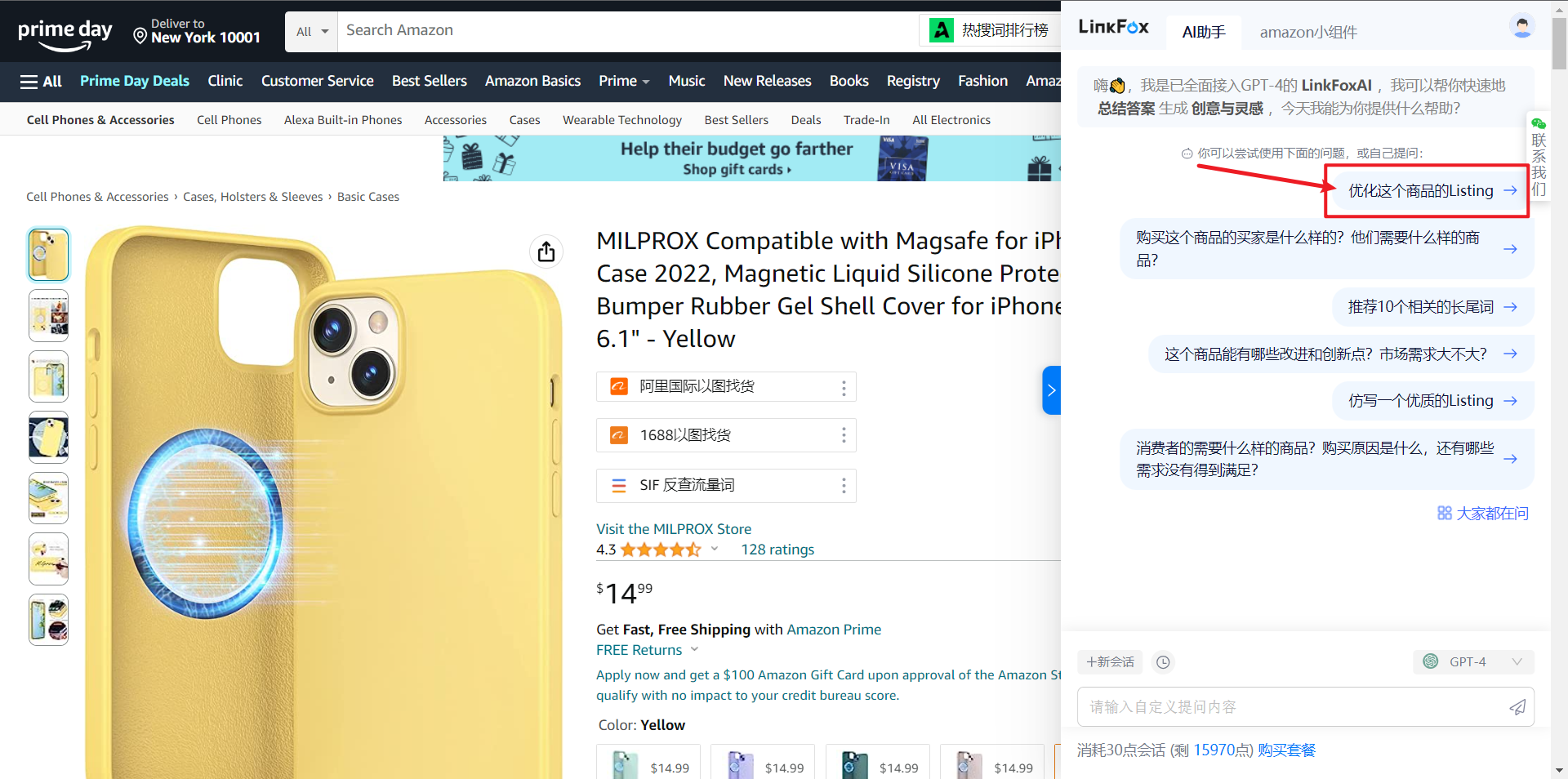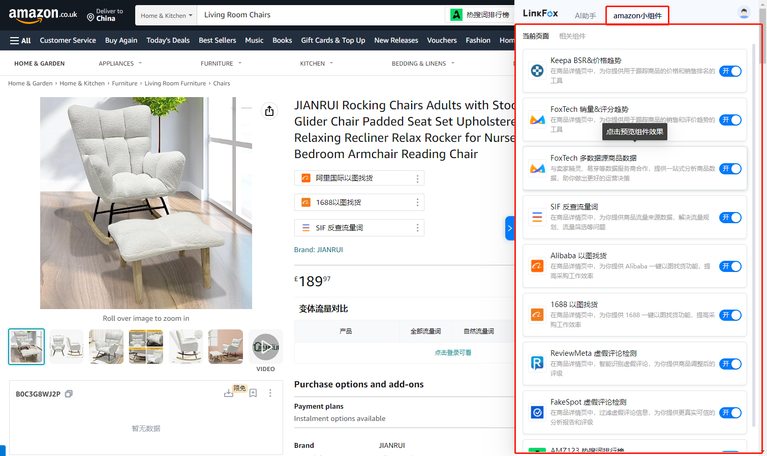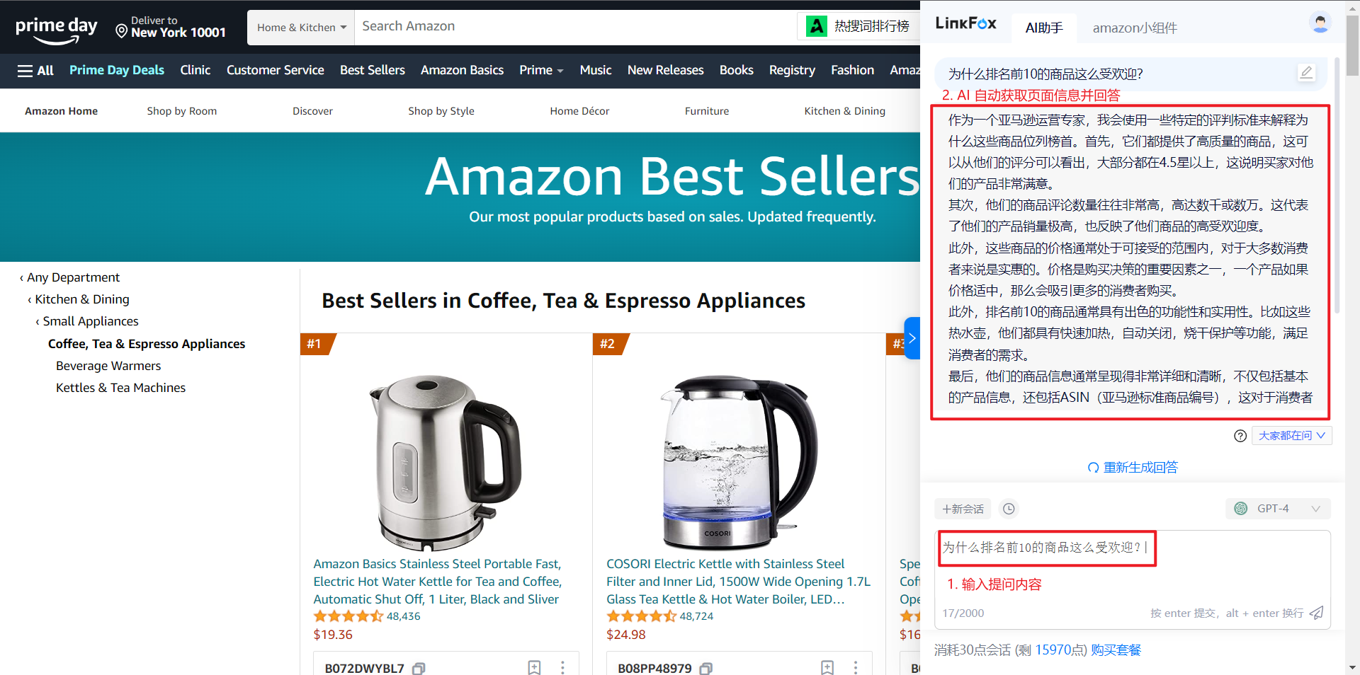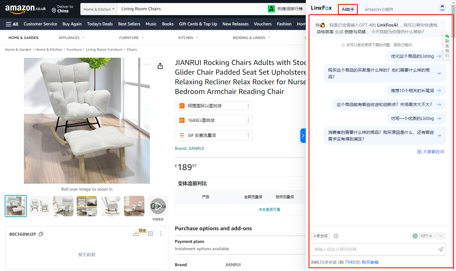 如果想在跨境运营过程中,实时查看 Amazon 商品数据,快速识别页面信息,随时与 AI 聊天,可以使用 LinkFox 插件,比如优化 Listing、商品评论分析、榜单页的市场调研、选品等。