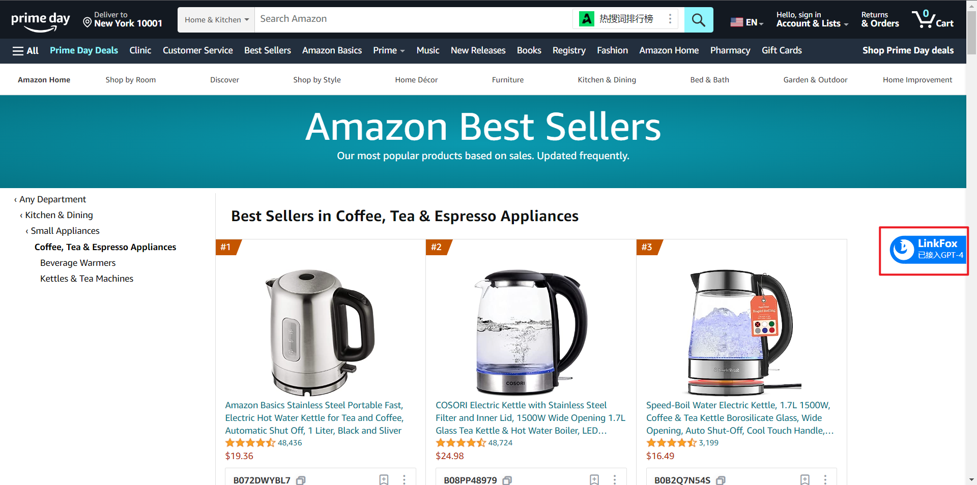 1) 打开 BestSeller,子类目页,点击【LinkFox 悬浮图标】,打开插件面板