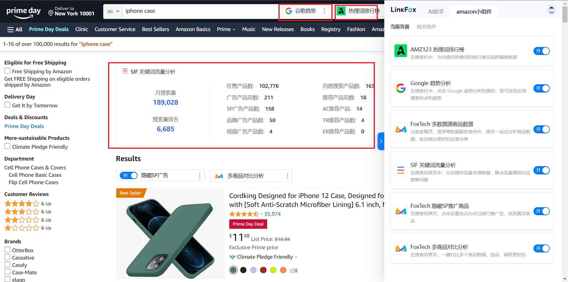 1)输入关键词“iphone case”,进入搜索结果页,可通过谷歌趋势、热搜词排行榜、SIF 关键词流量分析查看和分析当前关键词的热度和排行情况。